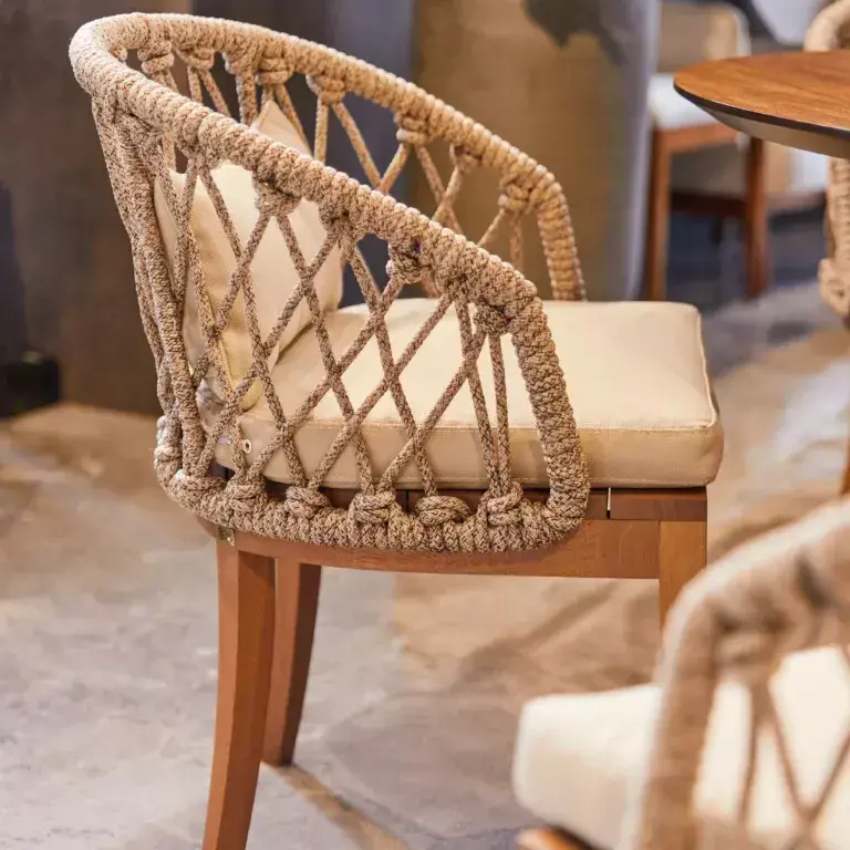 Estructura de madera Golden Teka con tornillos de acero inoxidable. Asiento de espuma D26. Cojines sueltos.