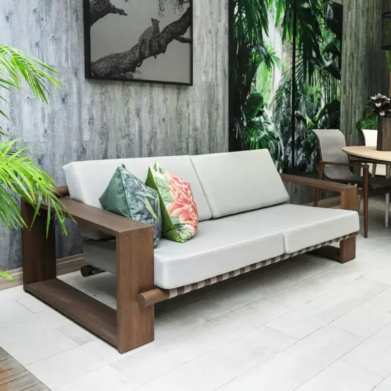 Madera Gold Teka. 3 Asientos con espuma D26 y tornillos de acero inoxidable. Detalle con tiras de poliester con PVC en Blanco, Azul o Fendi.